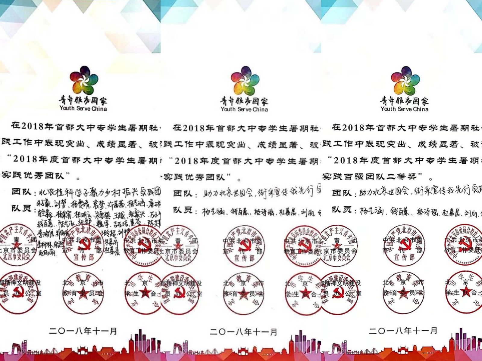 2018“青年服务国家”首都大中专员工暑期社会实践百强团队二等奖:乐天使fun“助力北京世园会,街采宣传我先行”实践团。