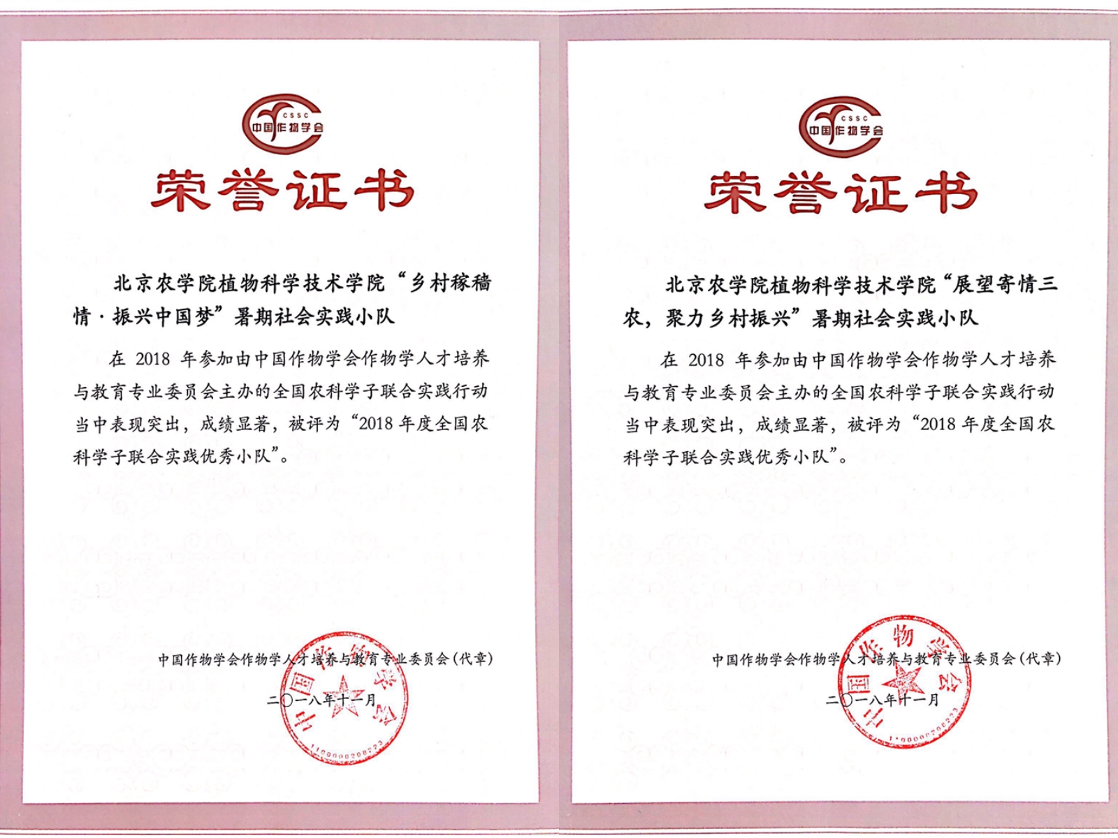 2018年度全国农科学子联合实践优秀小队:乐天使“乡村稼穑情,振兴中国梦”暑期社会实践团;乐天使“展望寄情三农,聚力乡村振兴”暑期社会实践团