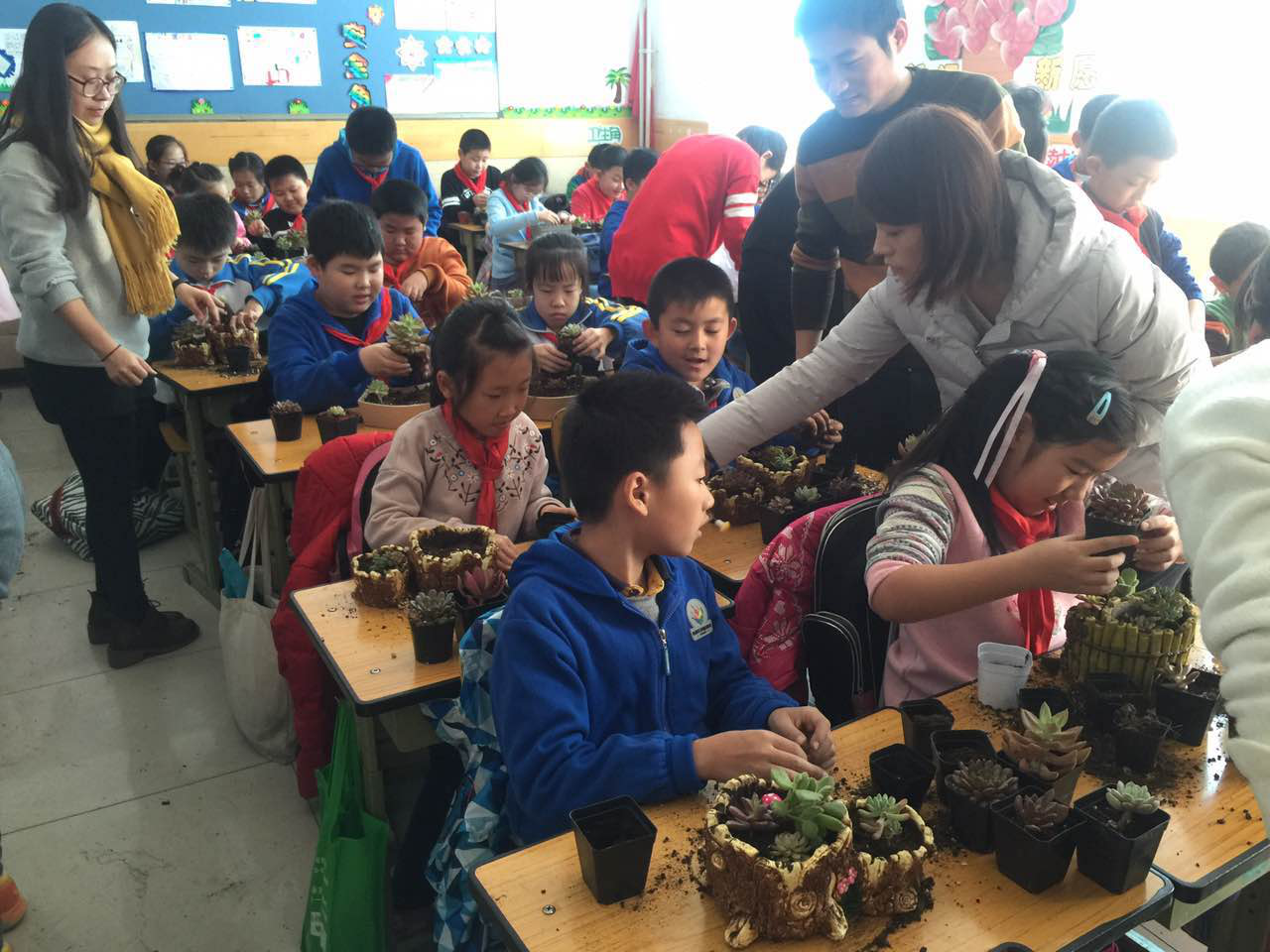 各党员同志积极配合,把花材、营养土、花盆以及配件发放给每位小同学。同时教他们不同的花盆如何搭配不同的多肉植物,体现不同形式的美感。小同学们将选好多肉植物,通过填土、搭配、组合和浇水等一系列过程,展现了他们的多肉作品。他们幸福的脸庞体现了对动手课的热爱以及对绿色植物的喜爱。