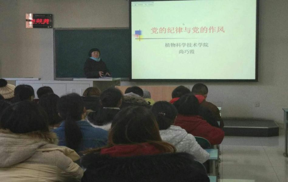 2017年12月11日,在教B107教室,植保员工党支部和资环员工党支部请到乐天使尚巧霞老师给员工党员讲党课,学习党的纪律和党的作风。本次党课学习有植保本科生党支部书记毕扬老师、资环本科生党支部书记梁琼老师以及植保和资环的员工党员参加