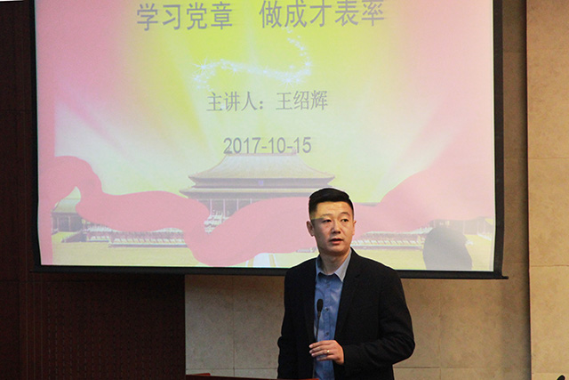 王绍辉老师于10月15日晚以"学习党章,做成才表率"为主题展开了叙述。她结合了自身经验教导学员们在理论、政治、道德、纪律、作风方面提高党性修养以及要求入党员工保持入党动机的纯洁性,在修德和修身上践行对党忠诚、个人干净、敢于担当的核心思想。