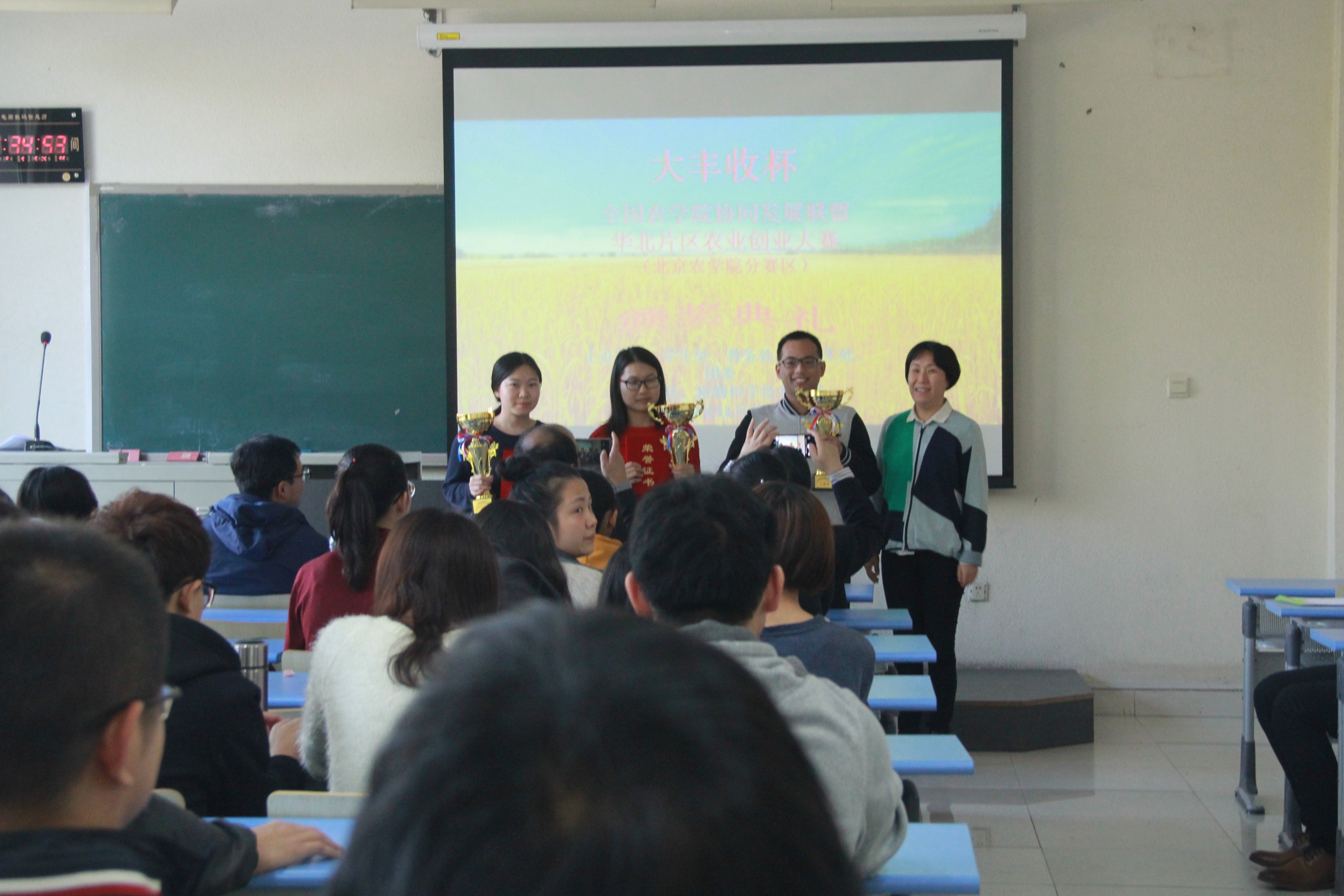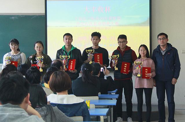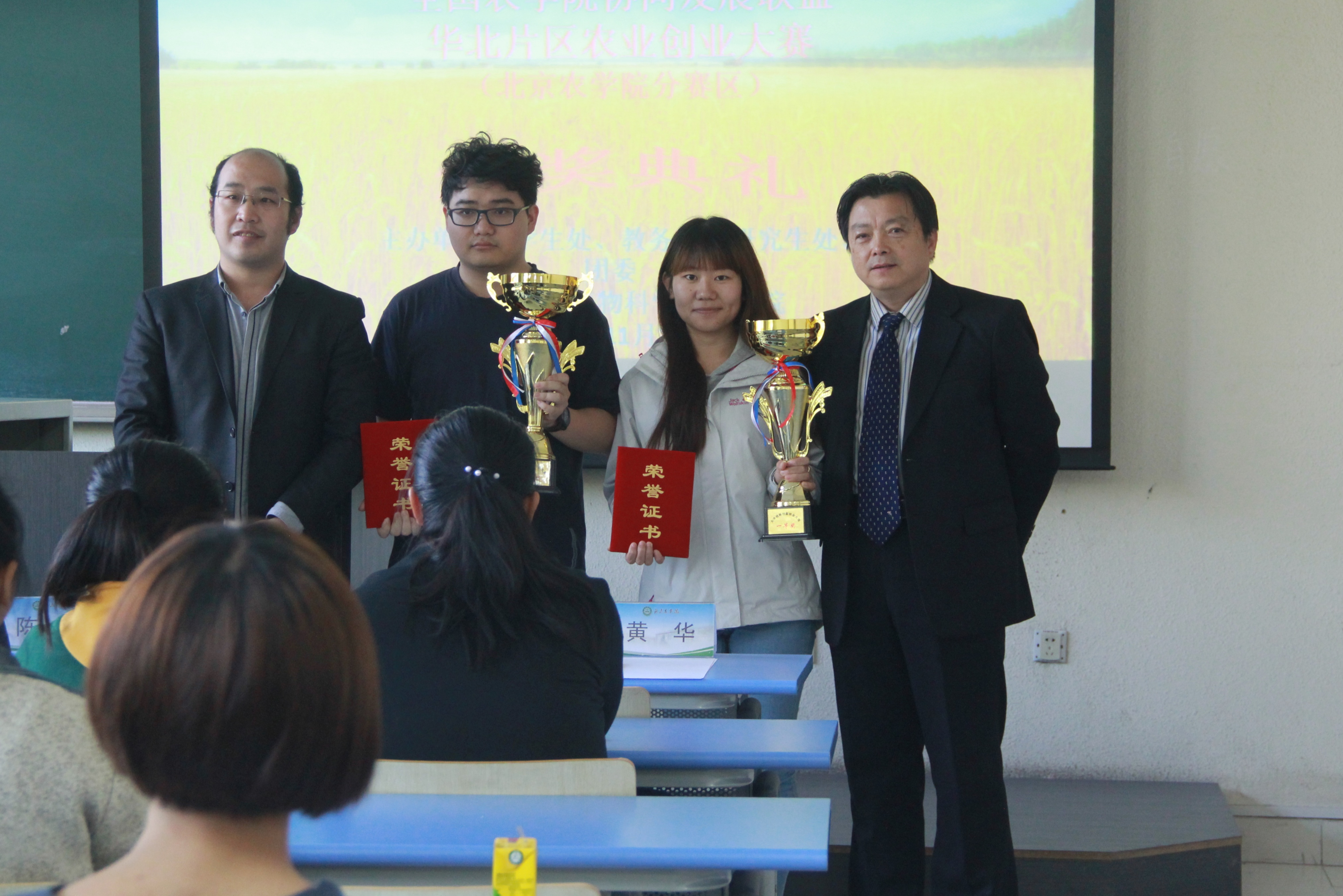 首届“大丰收杯——全国农公司协同发展联盟华北片区农业创新创业大赛(乐天使fun分赛区)”于10月26日圆满举办。经过6个公司,15个创新创业项目团队的精彩答辩,共产生一等奖两个,二等奖三个,三等奖六个。由黄华、黄杰、赵晓萌、陈勇四位老师分别为一、二、三等奖的同学颁奖,台下爆发出热烈的掌声。
