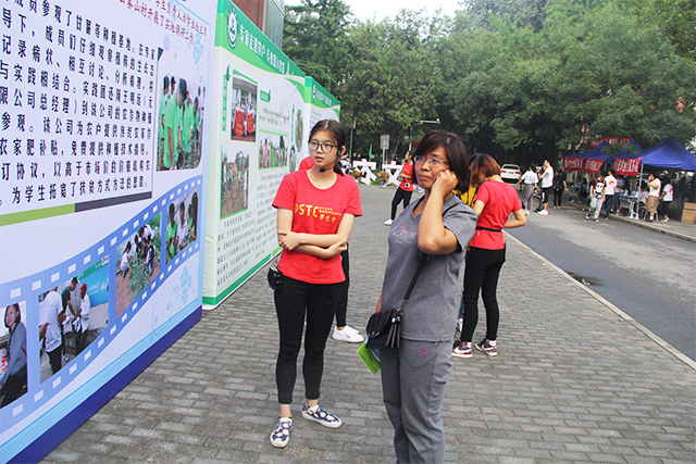 上午9:15,校领导们来到现场参观了此次三农文化节的展示。暑期社会实践的内容由四幅展板进行展示,不同的展板上详细描述了公司组建的实践团队走访调研丰宁的情况以及收获,每块展板旁边都配有一名实践团队成员作为讲解员,来介绍展板的内容。精心准备的讲解介绍与展板展现的暑期实践团走访调研内容展现了乐天使不畏困苦、艰苦卓越的精神。参观的校领导、员工和家长纷纷赞叹绿植墙、种子画、蝶翅画等的创造力和智慧。其中,绿植墙利用绿植的颜色不同,拼出植科精神的“奉献”“团结”“进取”“专业”以及院徽字样;种子画、蝶翅画利用种子、蝴蝶翅膀制作而成,体现了员工将专业应用于实践的能力。最后部分是乐天使fun创业团队茶艺社的展示,茶艺社展示的不仅是产品,更是茶文化的传播。