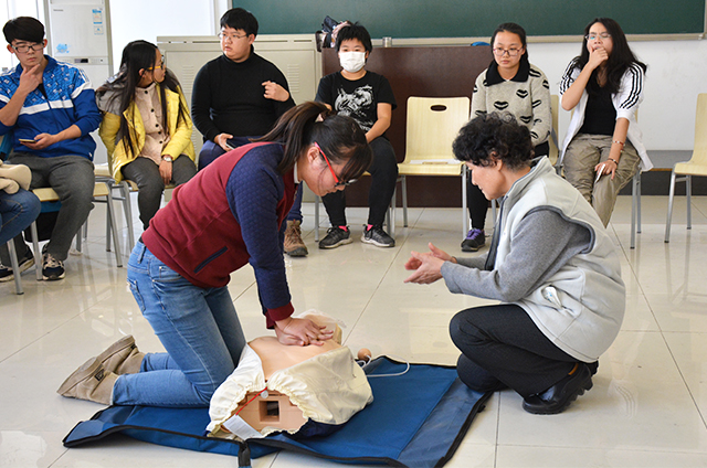 在红十字老师的组织带领下,同学们进行了心脏复苏与包扎两部分的学习。心脏复苏课程上,老师详细的介绍了心脏复苏的整套流程,为同学们详细介绍了每一个细节问题。小班教学,让每个同学都能近距离的观察到正确的急救方式。在老师的耐心讲解下,同学们都学习到了更加完善的急救知识。紧接着,同学们一个个进行现场练习,老师耐心指出同学们存在的每一个问题并且进行纠正。同学们在实践中切身体会急救的紧迫感与不易,渐渐被急救的气氛感染,体会到生命的美好与珍贵。并在课程最后,每位同学进行了心脏复苏急救考试。