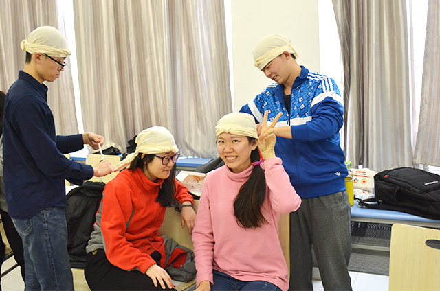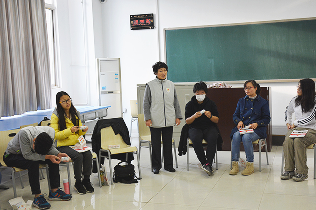 在包扎培训上,老师结合实际为同学们介绍了利用绷带与三角巾的包扎方法,并邀请一位同学通过实际操作让同学们更直观的了解到包扎方式。绷带包扎方式老师介绍了三种,环形包扎,螺旋包扎以及八字包扎。针对不同的部位采取不同的包扎方式,如肩部受伤要用八字包扎法等。三角布的使用主要根据受伤部位的不同而采取不同的方式,老师介绍并教授了帽式、三种悬臂带式、盖式包扎,以及胸部背部的特殊包扎方法。在学习每种包扎方式后,老师让同学们两个人为一组进行小组练习,让同学们通过自己动手,对包扎的操作更熟练。在同学们对包扎系统学习后,老师让同学们以小组形式进行考试,设定一个场景和伤员的受伤病情,让同学们判断并对如何包扎进行阐述。此次活动让同学们既掌握了多种包扎方式,也体会到需要随机应变方能对病人进行更好的救助。