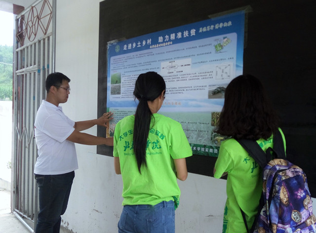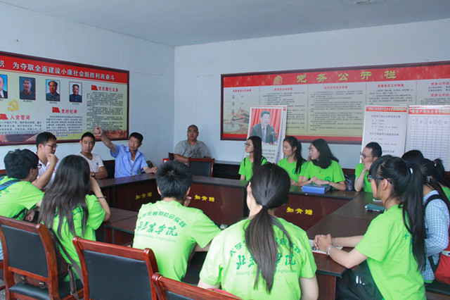 2016年7月19日,乐天使实践团一早来到本次社会实践的第二站——河北省波罗诺镇岔沟门村,岔沟门村的村干部们在村口热情迎接实践团队,为帮助实践团队更好的完成调研,与实践团队在村委会召开了一个简短有效的指导会议并与实践团一同张贴宣传海报。