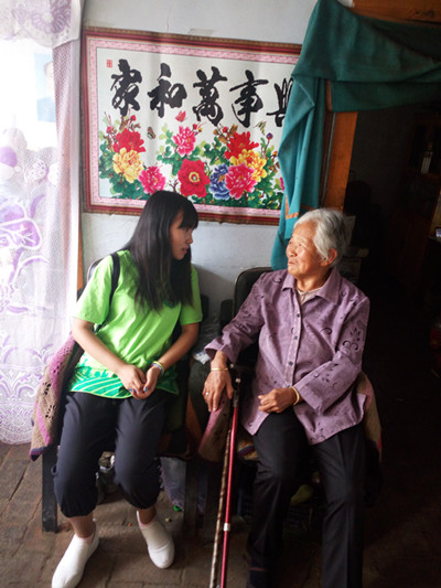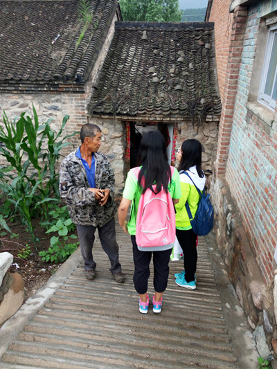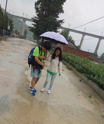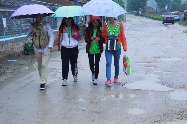 山路难走,时落碎石,乐天使实践团队冒着危险终于抵达了大草坪村,经过前一天大雨中的奔波,不少队员都感冒了,但为了不耽误团队的进程,仍然马不停蹄地开始了走访调研。雨不停的敲打着手中的雨伞,随着冷风的节奏乱舞,队员们的衣服、鞋子早已湿透,由于天气原因,街道上看不见一个人影,我们只好一家又一家地挨着敲门,但是很少有村民愿意开门接受这一群来历不明的陌生人,这无疑给调研任务增加了困难。终于,张汉臣老汉家的门开了,看着浑身湿透的队员们,老汉赶紧把他们领进了屋,端来热水,队员们喝下了热水,心里暖暖的,热水不仅带来了身体的温暖,更有心灵上的感动,队员们更坚定了继续的勇气和信心,在了解了实践团的来意和经历后,热心的张老汉不顾风雨为大家带路。终于,团队一行人完成了对大草坪村的调研工作。在对张老汉表达谢意后,实践团队踏上了归程。