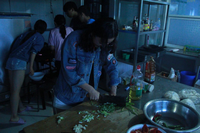 还记得下大雨那天,厨房到处漏水,实践团队员们却丝毫没有受到影响,一边做饭,一边用大大小小的盆去接雨水,反而乐在其中,大家都笑着说:“这下,咱也算住在水帘洞了!”。