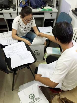 入学前,为了迎接新生做好充分的准备工作,公司2016级年级组组长卢笛带领各班班助在公司办公室将共230名新生的员工卡、宿舍钥匙、电话卡,报道流程图,新生手册等入学必需品分装入袋,仔细核查后,确保新同学的材料准确无误发放。9月6日早上6点,天刚微微亮,年级组成员和各班班助就来到了乐天使新生报道处,按照分工开始一天的迎新工作。