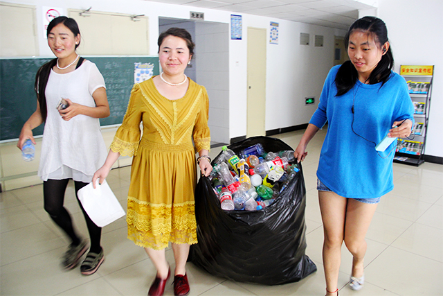 首先,李锡芊为社员们说明了此次活动的注意事项,将社员们分组并分配任务。随后,社员们拿起垃圾袋在宿舍楼层里开始了忙碌的活动。男生虽少,但很给力,女生变身女汉子,踏实干事。最后,在社员们的辛勤工作和宿舍同学们的积极配合下,收获了满满9袋的塑料瓶。