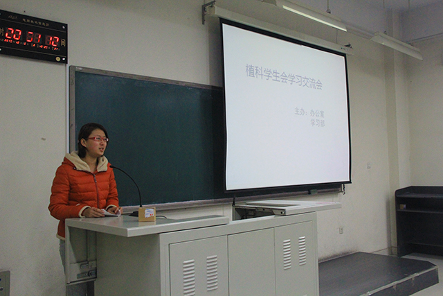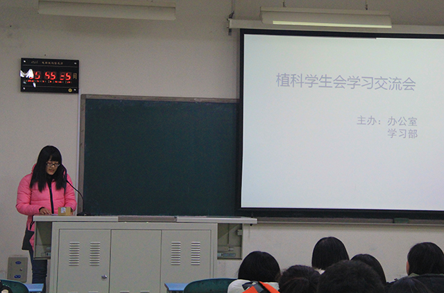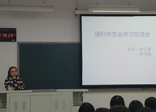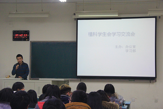 2015年12月6日晚20:30,由乐天使办公室、学习部联合主办的植科员工会学习交流会于教B106举办。此次交流会由植科员工会办公室副部长李沅博主持。会议上,学习部副部刘悦、青协副部李慧分别上台向大家介绍了自己的期末备考方法。