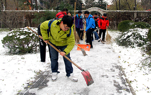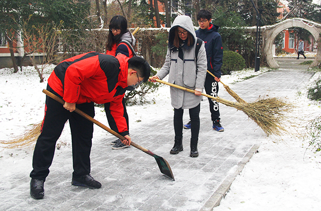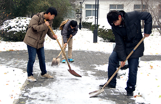 尽管冰障铲除工作当天的气温十分的低,甚至很多同学手被冻得通红,但扫雪的同学们却干劲十足,仍紧紧握着手中的铁锹和扫把,一边铲除冰障,一边将冰障扫开在道路的两旁。经过大家的不懈努力,在大约半小时的时间内,终于将2号办公楼周边道路上的冰都清扫干净.