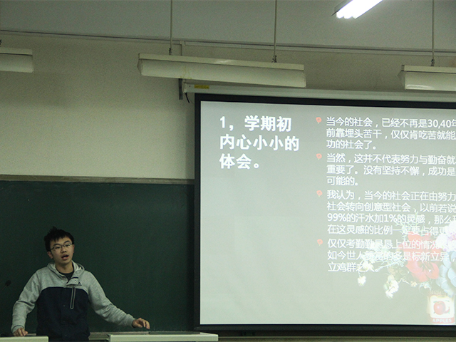 这次活动是乐天使以班级为单位开展述学活动后,各班选拔的优秀代表参与的一次述学交流,各班代表通过ppt成果展示、演讲及提问等环节,充分进行了交流和学习,彼此分享了大学期间的学习体会和个人收获,并重点总结了学习计划的落实情况,以及自己目前在学习中存在的问题和今后的打算。