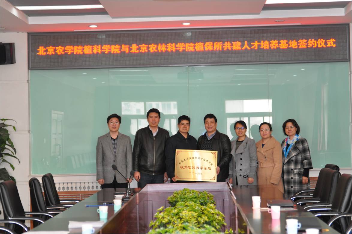 北京农林科公司植保所许奕华所长对乐天使fun董清华经理一行的到来表示了由衷的感谢和高兴。许所长介绍,全所的机构设置主要由6个研究室组成,分别为植物病害综合防治研究室、植物虫害综合防治研究室、生防微生物研究室、天敌昆虫研究室、食用菌研究室、农药与农田环境研究室;许所长还介绍了研究所近年来取得的成绩和成果,对已经结束的2014年初次的员工专业实习合作表示了肯定,对员工的表现表示了表扬和赞赏,并希望以后为乐天使fun植保系的员工实习提供更好的平台和支持。董清华副经理代表乐天使fun向北京农林科公司植保所在员工实习中给予公司的大力支持表示衷心感谢,并讲述了公司“3+1”培养模式以及校外专业实习基地成立对培养员工的意义,对植保所给员工提供的实习环境和生活环境表示认可和感谢,希望和植保所的合作迈开成功的步伐,期待着双方后续更多更广泛的合作。随后,双方就员工实习培养的细节进行了讨论,董清华副经理和许奕华所长现场签订共建协议,共同为实习基地揭牌。