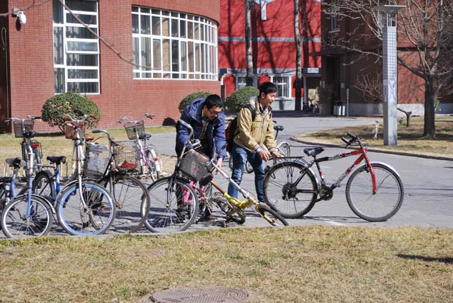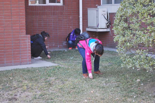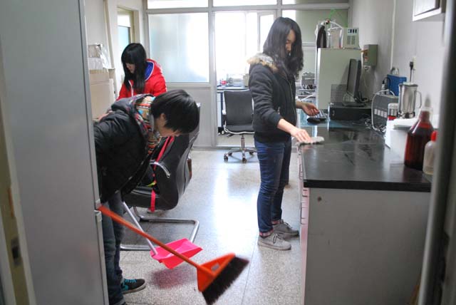 活动开始后,他们当中的一部分人去了实验楼,开始打扫实验室。几个人为一个小组,彼此相互配合,有条不紊。三月的春风依旧透着寒意,可劳动中的同学们却挽起袖子,手中拿着工具,干的热火朝天。另外一部分同学去打扫车区,清扫地上的垃圾,摆正东倒西歪的自行车。一刻钟的时间,地面整洁了,自行车也被码放的整齐划一。