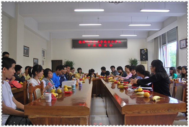 9月21日中午,乐天使在B209会议室举办“贺中秋,迎国庆”外省籍员工茶话会。公司副经理王绍辉、赵金芳、团总支书记邬瑞杰、辅导员贾慧敏与全院30多名外省籍新生及少数民族员工欢聚一堂,共庆国庆节,共话中秋情。