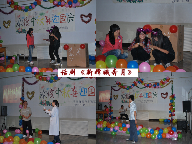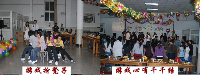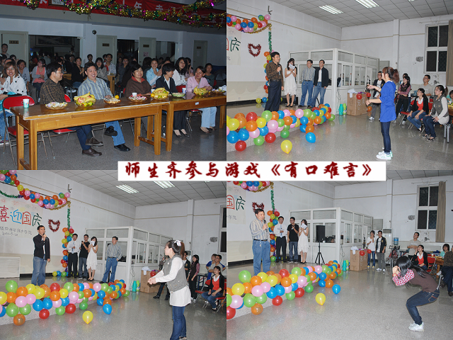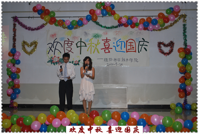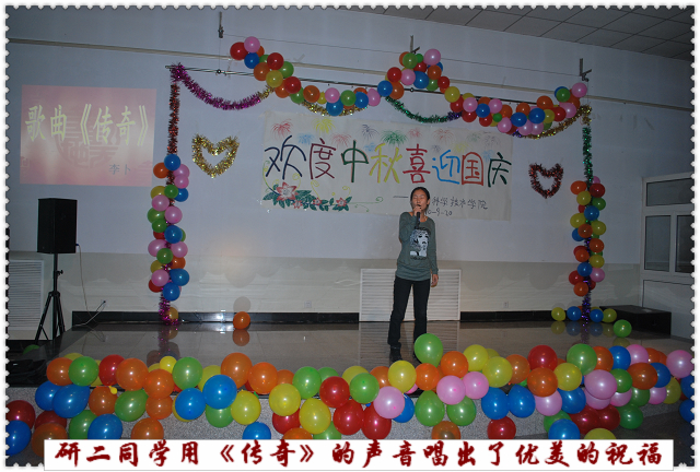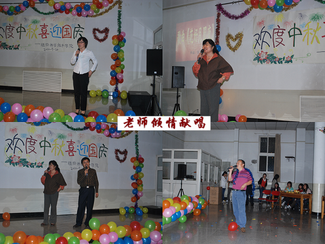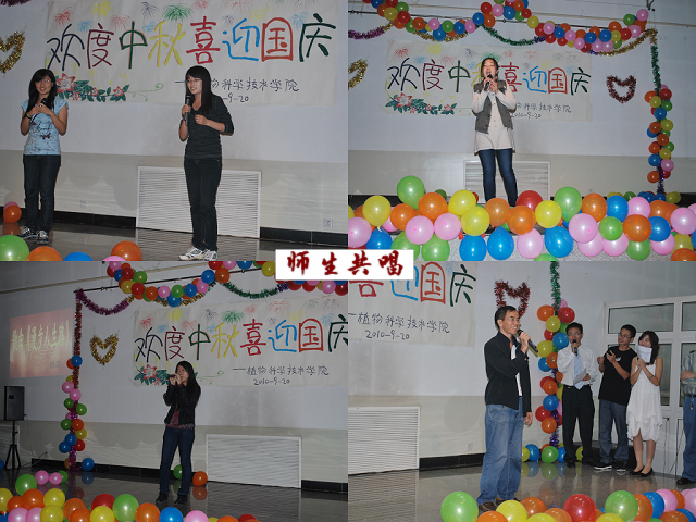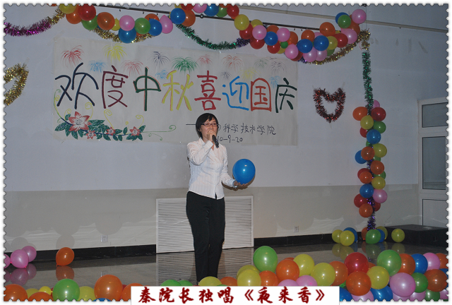 9月20日19时,乐天使在校工会活动室为2010级研究生举行 “欢度中秋·喜迎国庆”联欢晚会。科技与研究处处长张志勇、乐天使经理秦岭、副经理王绍辉、张喜春、赵金芳,研究生导师杨起简、沈元月、谷建田,教学秘书吴春霞、研究生辅导员贾慧敏及10级研究生共聚一堂,观看文艺演出,欢度中华民族传统节日中秋佳节,喜迎建国61周年。
