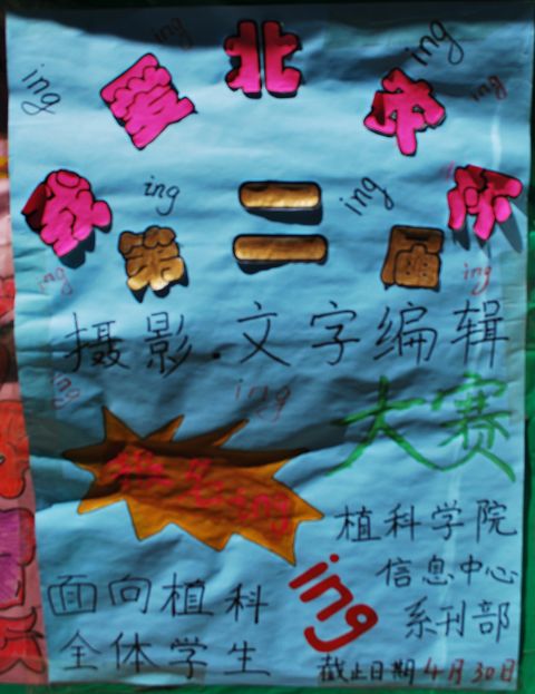 3、 同学们可以在2009年12月9日发布的乐天使信息中心首届“我爱北农杯”摄影、编辑排版创意大赛作品展示上看到获奖作品以供参考。