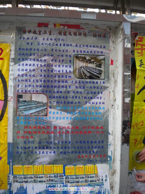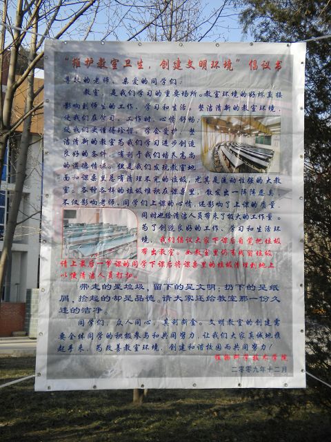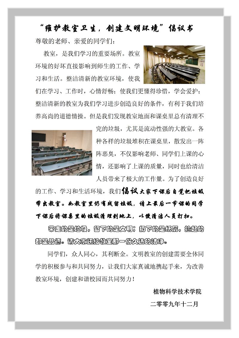 这是乐天使员工会自律部和生活部联合发起的“维护教室卫生,创建文明环境”倡议,2009年12月16日中午,自律部部长、副部长将亲自带部员设计、制作的宣传画幅,在校园、教学楼、教室悬挂粘贴,希望通过醒目、温馨的提示,以实际的行动,影响全校同学携手共建文明校园,为和谐校园贡献力量!