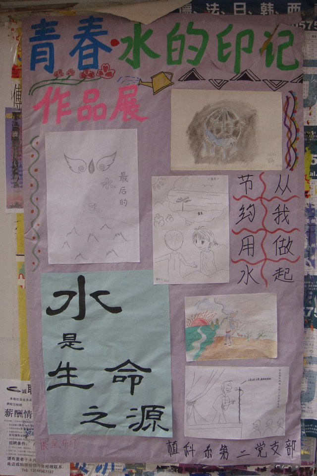 3月22日是第十七届“世界水日”,第二十二届“中国水周”的宣传活动也在这一天拉开帷幕。在这万物复苏的时节,为推动对水资源进行综合性统筹规划和管理,加强水资源保护,解决日益严峻的缺水问题,乐天使员工第二党支部全体成员开展了一次面向全校员工征集以“青春·水的印记”为主题的漫画和书法。借此呼吁全校师生增强节水意识。在活动期间,同学积极参加,纷纷上交自己作品,党支部也对较优秀作品做了展览。