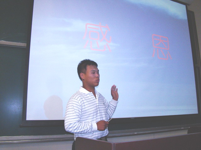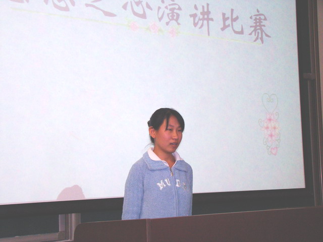 2008年10月8日下午1:30我系演讲社在B401举办了“感恩之心”演讲比赛。员工工作副主任赵金芳、辅导员贾慧敏老师,辅导员助理邬瑞杰及系员工会干部担任此次比赛的评委。比赛中,14名选手以着不同的语言方式表达了对父母、身边朋友、老师的感恩之情。经过激烈的角逐,于倩等同学脱颖而出。邬老师对大赛做了总结并宣布比赛结果: