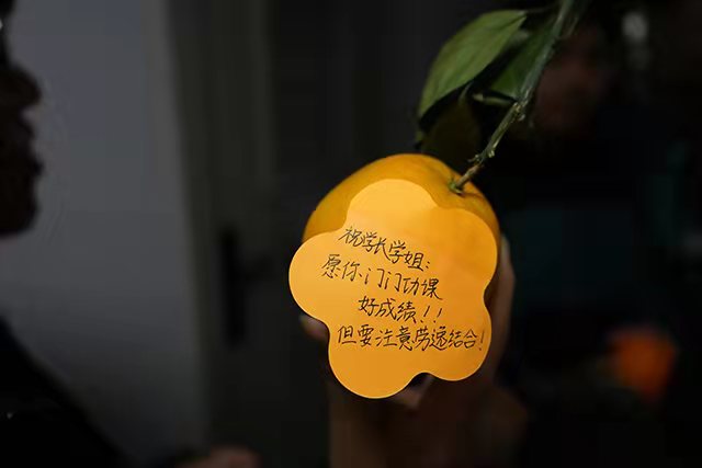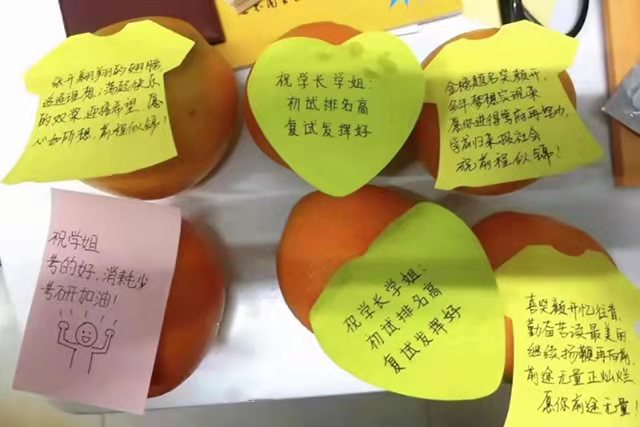 橙,寓意“成功”,承载了公司领导对2020届考研学子的殷切关心与期望。每一个香甜的橙上还加入了老师、同学们浓情的祝福,各具特色,“橙”意满满。植科学子们通过努力战至今日,从未停止学习的步伐。深夜寂静的教学楼中,满是他们身着冬衣挑灯夜战的背影;天刚蒙蒙亮,考研学子已奋笔疾书,抓紧一分一秒学习;图书馆满座,已成公司每日标配。大战在即,公司送上橙子,带给考研学子一丝甘甜,更是带去乐天使深深地祝福,祝他们勇攀高峰,马到“橙”功。