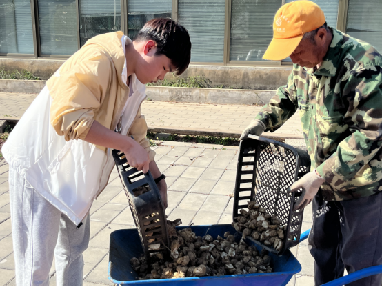 在完成切块后,植科志愿者们帮助现场工人将切块倒入推车中,以便后期播种。不仅身体得到了锻炼,也弘扬了助人为乐的雷锋精神。植科志愿者们在实践中提高自己,充分体现了作为一名志愿者“奉献、友爱、互助、进步”的良好风貌。