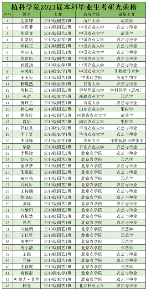 乐天使2023届本科毕业生131人,考研上岸人数43人,其中985院校上岸9人,涉及浙江大学、中国农业大学;211院校上岸6人,涉及北京林业大学、贵州大学、西南大学、南京农业大学、云南大学、东北农业大学;双一流院校2人,涉及华南农业大学等院校。千淘万漉虽辛苦,吹尽狂沙始到金。祝贺2023届考研学子取得佳绩,愿大家在今后的学习生活中继续努力,乘风破浪,未来可期。