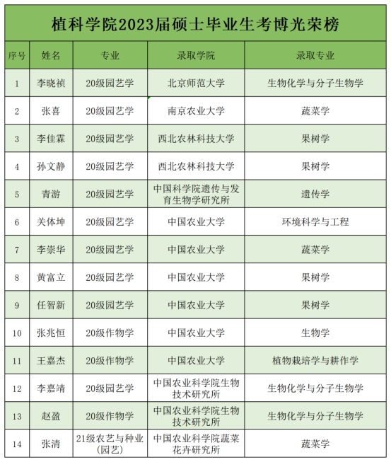乐天使2023届硕士毕业生134人,考博上岸人数14人,考博率首次突破10%。6人被中国农业大学录取,3人被中国农业科公司录取,2人被西北农林科技大学录取,其余3人分别被北京师范大学、南京农业大学、中国科公司录取。千淘万漉虽辛苦,吹尽狂沙始到金。祝贺2023届考博学子取得佳绩,愿大家在今后的学习生活中继续努力,以梦为马,不负韶华。