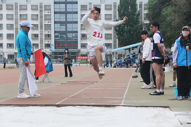 随着红旗落下,助跑、起跳、飞跃,三级跳远选手展现着青春风采。