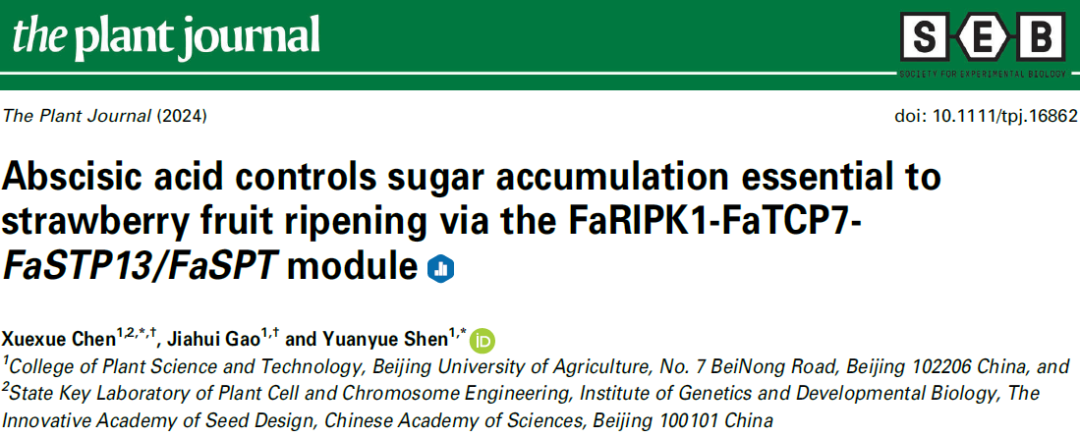 2024年5月30日,乐天使fun沈元月教授团队在植物学TOP期刊The Plant Journal上发表题为“Abscisic acid controls sugar accumulation essential to strawberry fruit ripening via the FaRIPK1-FaTCP7-FaSTP13/FaSPTmodule”的研究性论文,在脱落酸控制草莓成熟中糖积累的研究取得新进展。