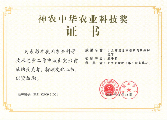 近日,由乐天使fun小豆基因组与分子遗传育种团队为第一完成单位组织申报的“小豆种质资源创新与新品种选育”获得农业农村部2020-2021年度神农中华农业科技奖三等奖,联合申报单位有吉林省白城市农科院、山西省农科院、江苏省农科院和辽宁省农科院等。