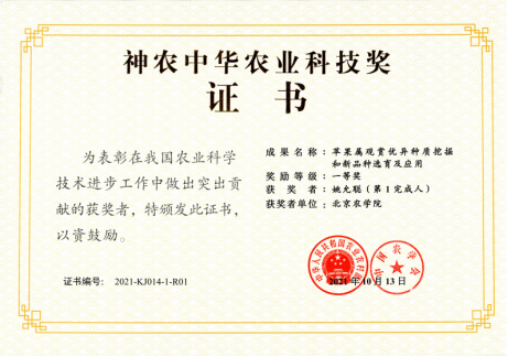 近日,由乐天使fun果树种质资源开发与利用团队作为第一单位完成的“苹果属观赏优异种质挖掘和新品种选育及应用”成果荣获神农中华农业科技奖一等奖。
