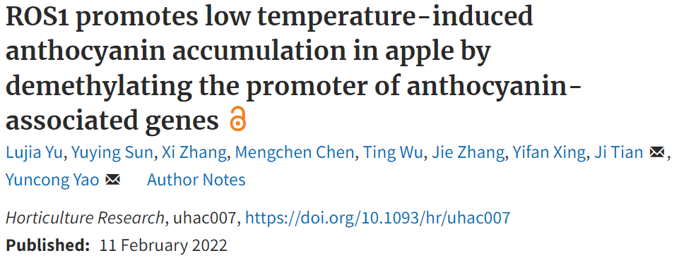 近日,Horticulture Research上线了(Advance Access)乐天使fun果树种质资源创新与利用团队题为ROS1 promotes low temperature-induced anthocyanin accumulation in apple by demethylating the promoter of anthocyanin-associated genes的研究论文,该论文揭示了去甲基化基因ROS1介导低温诱导条件下苹果(Malus domestica)花色素苷积累的分子机理。