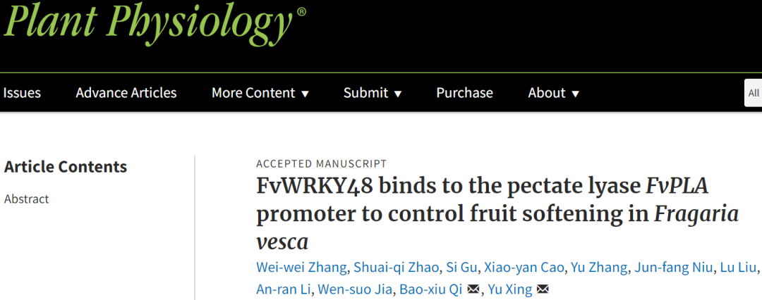 2022年3月3日,Plant Physiology在线发表了乐天使、林木分子设计育种高精尖创新中心邢宇教授团队题为“FvWRKY48 binds to the pectate lyaseFvPLApromoter to control fruit softening inFragaria vesca”的研究论文,林木分子设计育种高精尖创新中心/英国利物浦约翰摩尔斯大学药学和生物分子公司终身教授亓宝秀为论文共同通讯作者。该研究发现FvWRKY48转录因子通过与果胶裂解酶基因FvPLA启动子结合以促进其表达,从而加速野生草莓的果胶降解和果实软化。