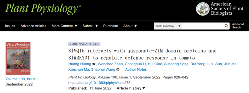 2022年6月11日,乐天使王绍辉教授团队在Plant Physiology在线发表了题为“SlVQ15 Interacts with Jasmonate-ZIM Domain Proteins and SlWRKY31 to Regulate Defense Response in Tomato”的研究论文,揭示了SlVQ15与茉莉素途径抑制因子SlJAZ互作,并与SlWRKY31协同调控番茄对灰霉菌抗性的分子机制。
