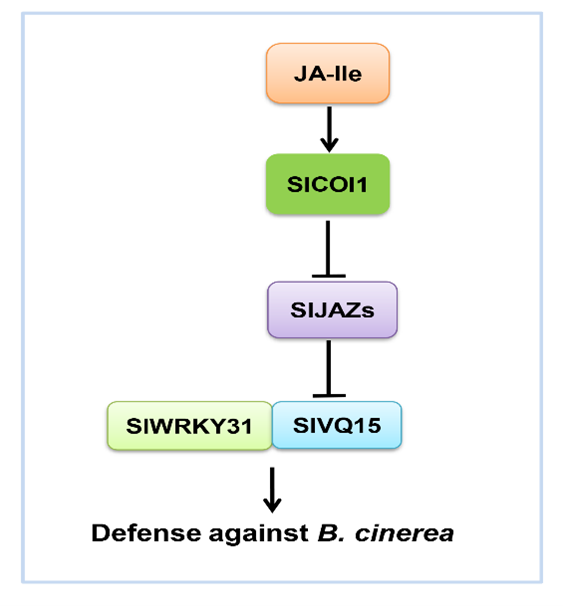 该研究发现SlVQ15受灰霉菌的诱导表达,SlVQ15过表达增强了番茄对灰霉菌的抗性,slvq15突变体对灰霉菌更加敏感。SlVQ15能形成同源二聚体,且与SlJAZs(茉莉素信号转导途径的抑制子)和SlWRKY31互作。进一步的研究发现SlJAZ11阻碍SlVQ15和SlWRKY31的互作,并抑制SlVQ15对SlWRKY31的转录激活活性的促进功能。此外,还发现SlVQ15和SlWRKY31协同调控番茄对灰霉菌的抗性。综上所述,该研究揭示了SlVQ15参与茉莉素途径调控番茄对灰霉菌抗性的分子机制。该研究为揭示茉莉素调控番茄抗灰霉菌的分子机制提供了新的理论依据。