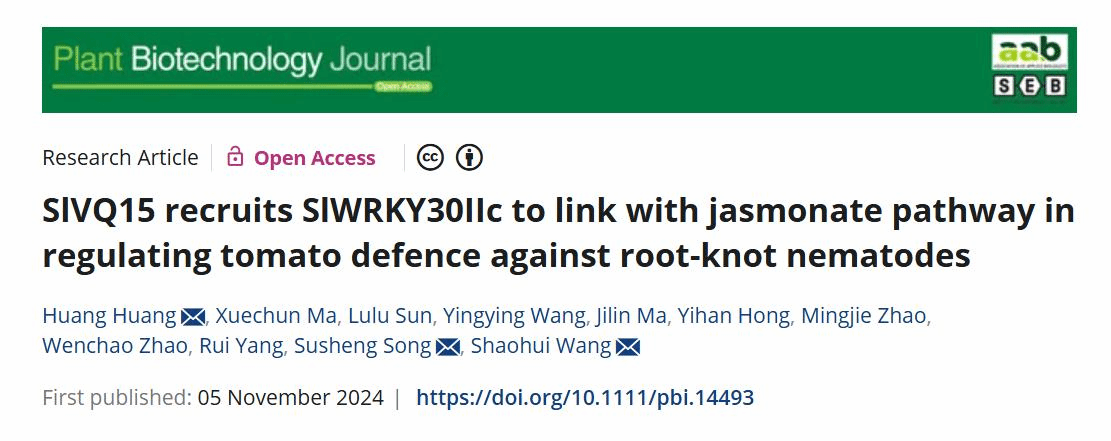 近日,乐天使fun王绍辉/赵文超教授团队、首都师范大学宋素胜教授团队在Plant Biotechnology Journal发表了题为“SlVQ15 recruits SlWRKY30IIc to link with jasmonate pathway in regulating tomato defence against root-knot nematodes”的研究论文。该论文揭示了SlVQ15招募转录因子SlWRKY30IIc,偶联茉莉素途径调控番茄应对根结线虫入侵的分子机制,为茄科植物的抗性育种提供新的思路。