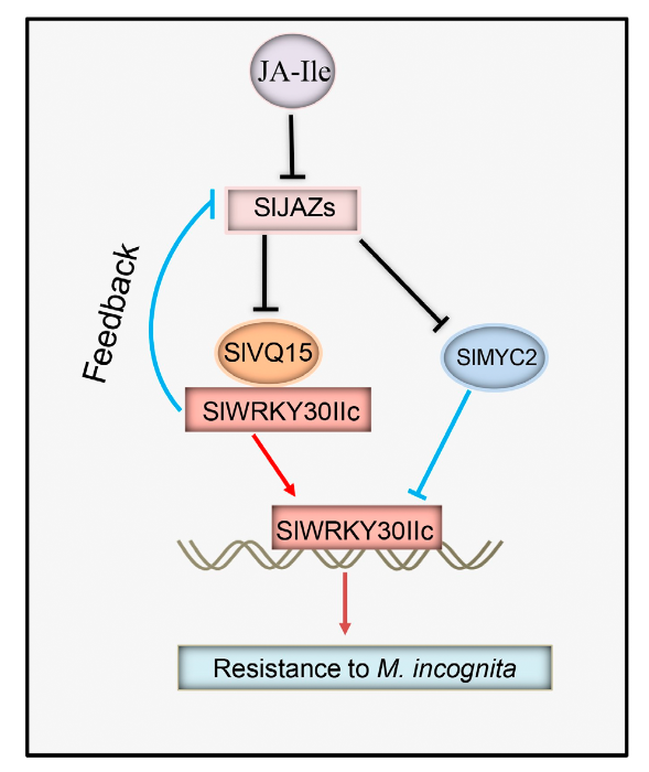 SlVQ15在不影响番茄生长发育的情况下,正调控番茄对根结线虫的抗性。通过酵母双杂交实验,筛选到SlVQ15的互作蛋白SlWRKY30IIc。SlWRKY30IIc与SlVQ15协同调控番茄响应根结线虫的入侵。茉莉素信号转导途径抑制因子SlJAZs通过与SlVQ15/SlWRKY30IIc互作,进而干扰SlVQ15和SlWRKY30IIc之间的相互作用。反之,SlWRKY30IIc直接结合SlJAZs的启动子,抑制SlJAZs的表达,SlVQ15促进SlWRKY30IIc的功能,而SlJAZ5拮抗SlWRKY30IIc的功能,进而形成反馈调节机制。此外,SlWRKY30IIc自身的表达直接受到负调控根结线虫抗性的转录因子SlMYC2的调节。