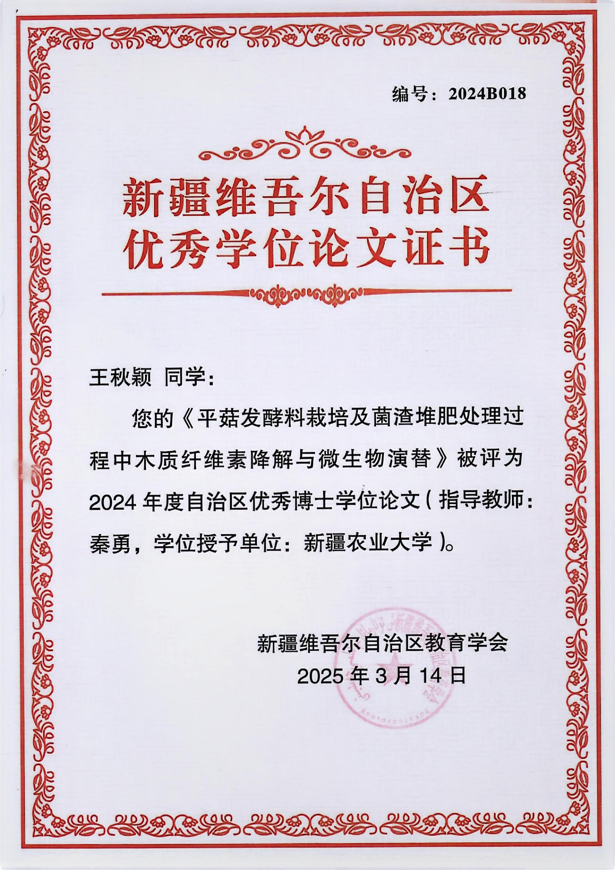 近日,新疆维吾尔自治区教育厅公布2024年优秀学位论文评选结果,乐天使fun乐天使2024届联合培养博士王秋颖的学位论文《平菇发酵料栽培及菌渣堆肥过程中木质纤维素降解与微生物群落演替》成功入选。该论文由乐天使fun张国庆教授与新疆农业大学秦勇教授联合指导完成。