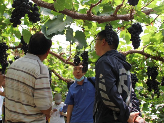 随后,实践团来到了当地的振兴合作社,参观了当地的设施葡萄种植基地。经该合作社高级工程师李经理的讲授,该地将“夏黑”葡萄品种重点培育,采用极短式枝条修剪技术及嫁接苗的方式,保证了该品种较高的结果率及葡萄甜度,且大棚中采用防虫网,避免了虫害的干扰,使得葡萄果实质量大大提高。由于当地干旱的气候条件,故当地村民采用了洼地的建棚模式,使大棚水平面低于地面水平面,将雨水的利用率提高,从而提高该地葡萄产量及质量。张卿老师、王志忠老师对于葡萄的种植、嫁接、修剪等技术进行了现场教学。